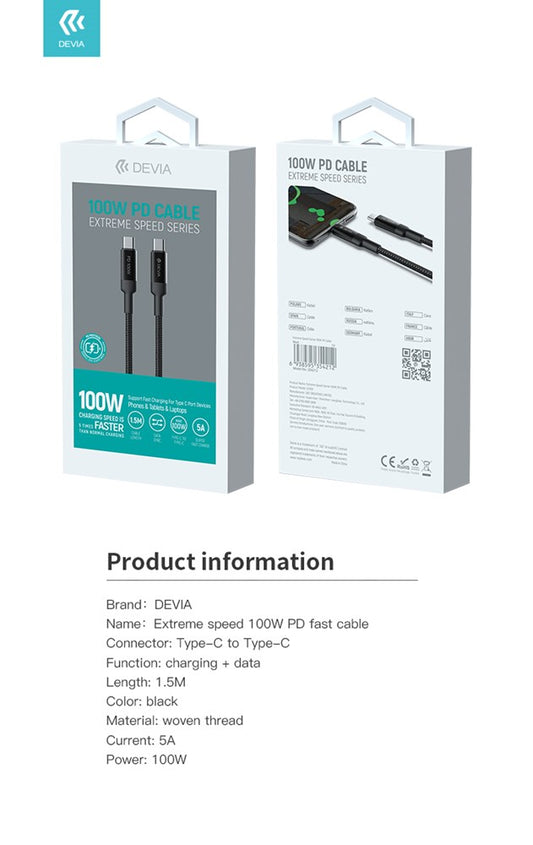 Devia - 1.5m (100W) Mesh Armour Power Delivery - Type C to Type C Cable - Black