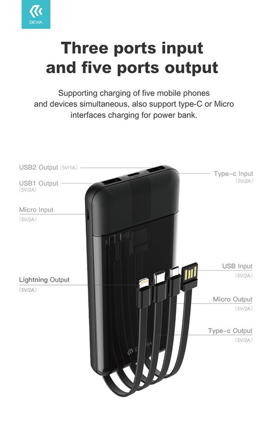 Devia - 10,000mAh Powerbank & USB, Lightning, MicroUSB & Type C Cable - Black